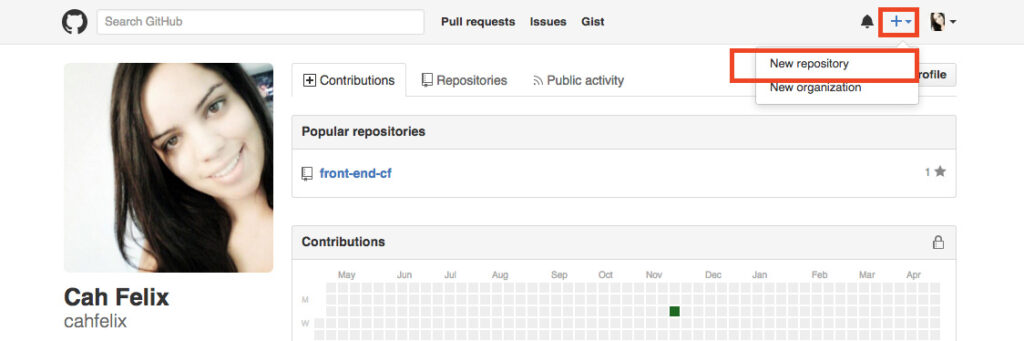 - No canto superior direito, clique no + e depois em Novo repositório.