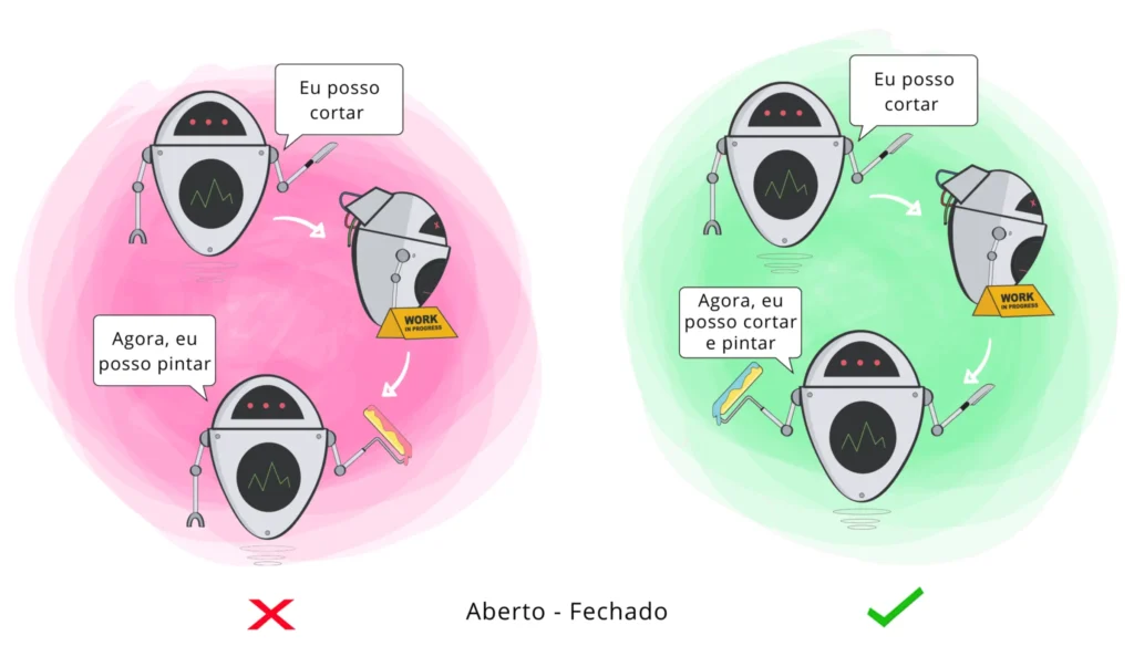 • A Ideia: Você deve conseguir adicionar novos comportamentos sem mexer no código que já está funcionando. Isso evita causar bugs onde a Classe estiver sendo usada. Então, se você deseja que a Classe execute mais funções, a abordagem ideal é acrescentar essas funções e NÃO alterar às que já existem.