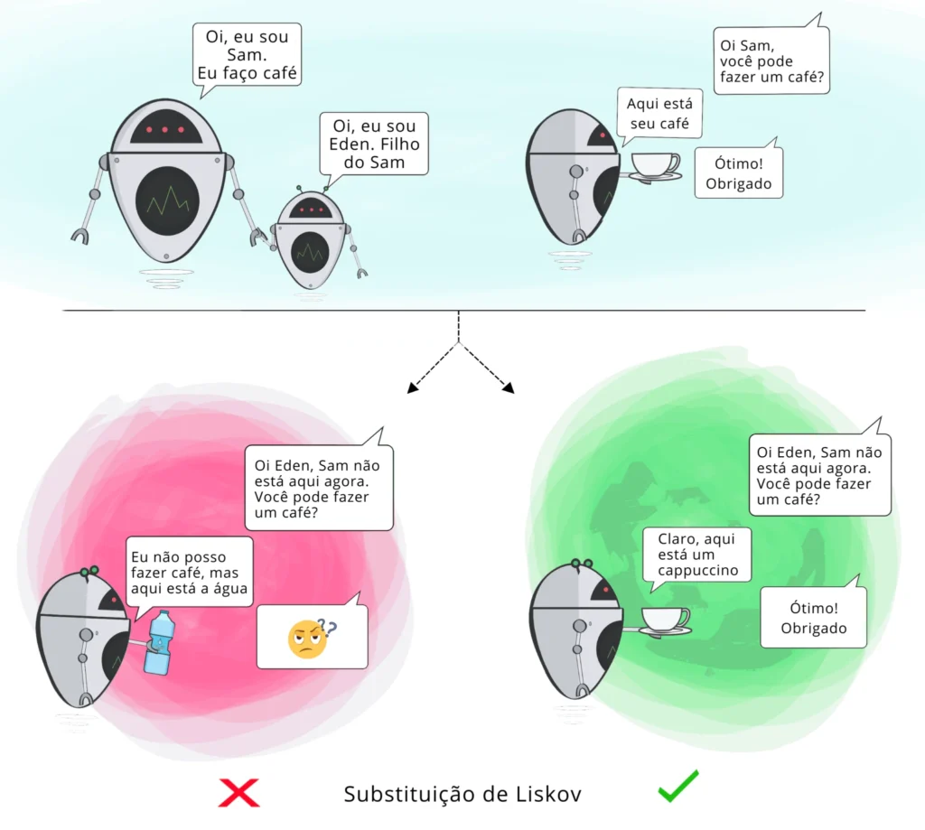 • A Ideia: Esse princípio busca impor consistência para que a Classe pai ou sua Classe filha possam ser usadas da mesma maneira sem erros. Se um código funciona com a classe pai, ele deve funcionar com qualquer filha, sem precisar de tratamentos especiais. Nesse caso, a Classe filha deve conseguir fazer tudo o que a Classe pai pode fazer. (esse processo é chamado de Herança)