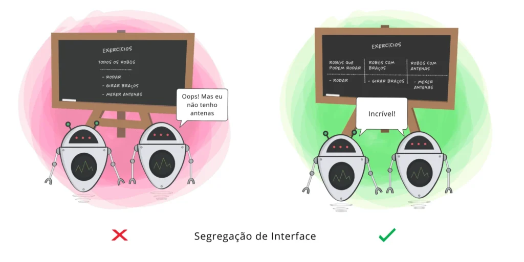 • A Ideia: Esse princípio busca dividir um conjunto de ações em conjuntos menores para a Classe executar SOMENTE as ações que precisa. É um desperdício quando uma Classe é obrigada a executar ações inúteis. Além disso, pode produzir bugs inesperados se essa Classe não tiver a capacidade de executar essas ações. É melhor ter várias interfaces pequenas e focadas do que uma “interface monstro”.
